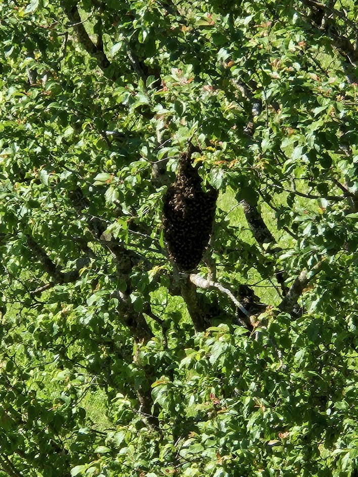 Bienenschwarm hoch im Zwetschgenbaum